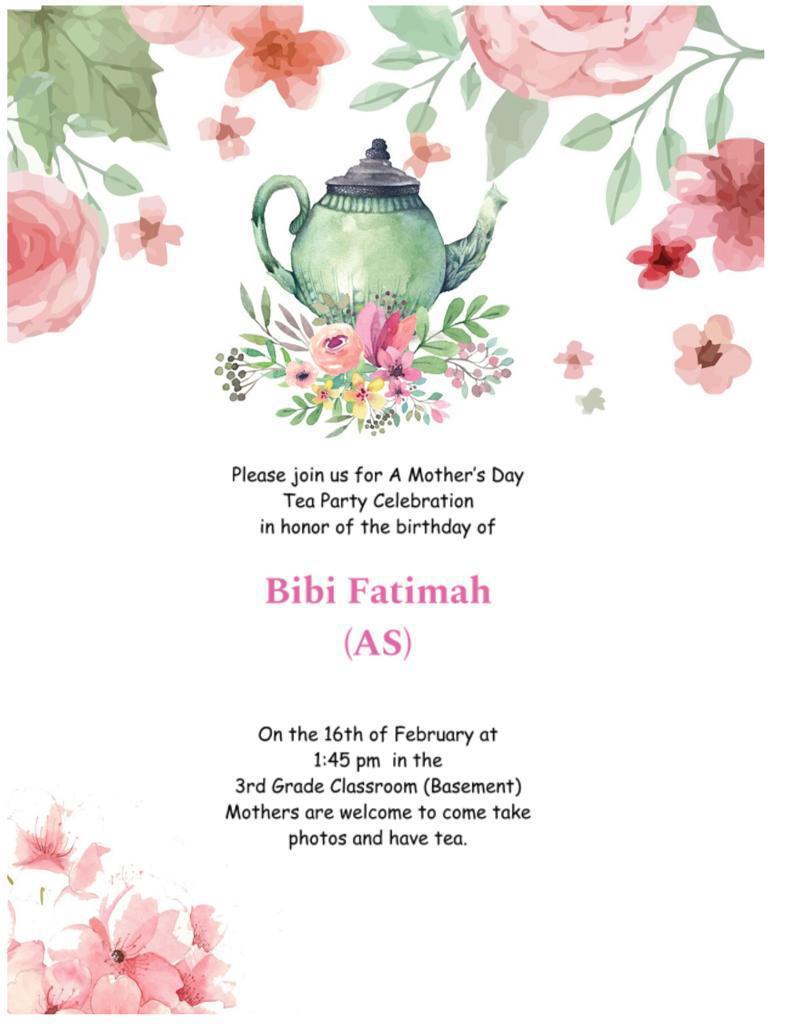 All PreK through 3rd grade mothers are invited to join us for a Tea Party Celebration in honor of the birthday of Bibi Fatimah (AS).